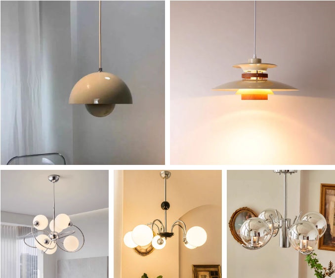 中古風燈具也極具幾何形態特征,最為常見的就是球形曲面的造型,或者衛星放射狀造型,以及飛碟圓盤型,所用的材料以玻璃、樹脂、或者金屬材料為主。