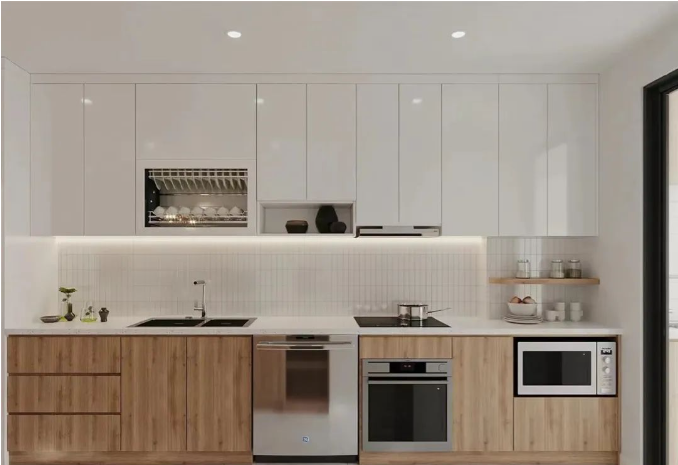 按照我們做菜的習慣來設計,可以參考:冰箱(取出)——水池(清洗)——備案臺(切)——灶臺(炒)——臺面(盛)。簡稱->->->四點,將廚房分為:水槽區、切菜區、炒菜區,一條流水線排列。