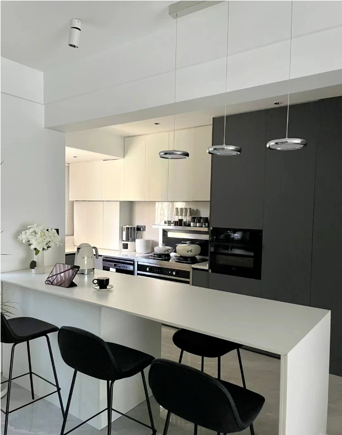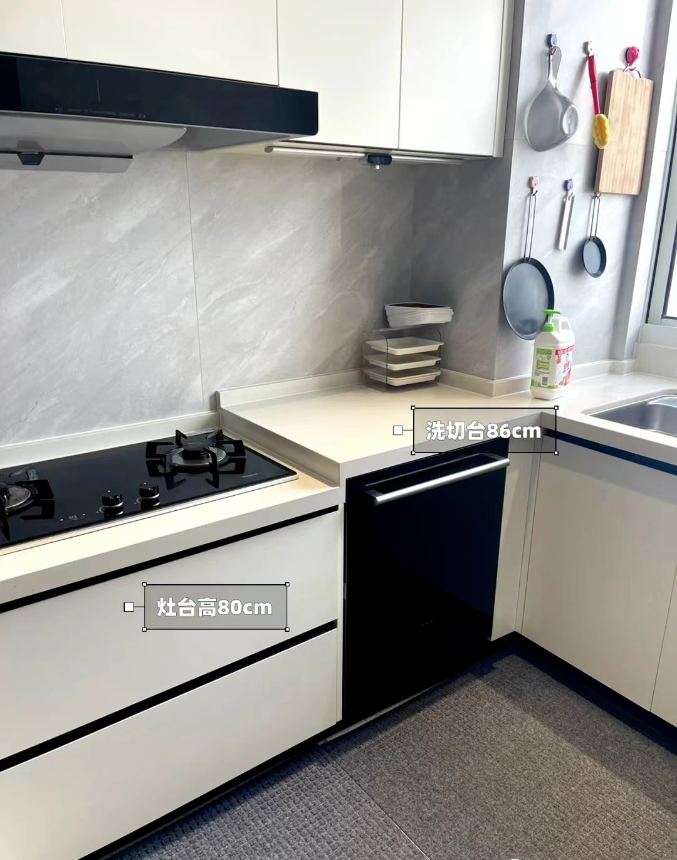 此外,廚房還可以根據需要設計高低臺。常規灶臺高度在70cm-80cm,或者按照做飯人的身高/2+10CM。水槽高度在80cm-90cm,兩個區域最好保留10cm的高度差,日常使用會更舒適。