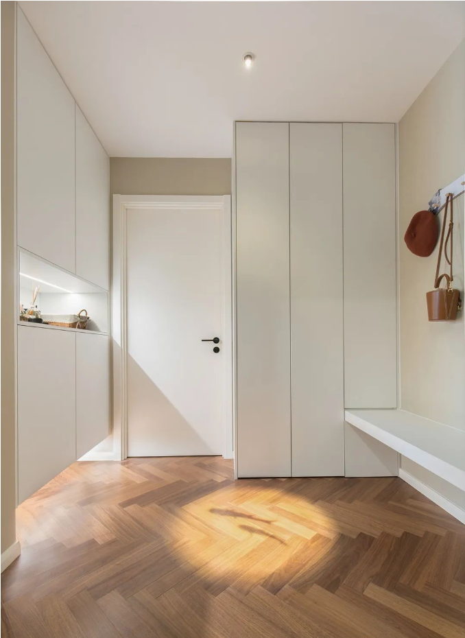 2、一體化玄關(guān)設(shè)計(jì):結(jié)合鞋柜、穿衣鏡、換鞋凳和洗手臺(tái),這樣的設(shè)計(jì)既節(jié)省空間,又功能豐富。