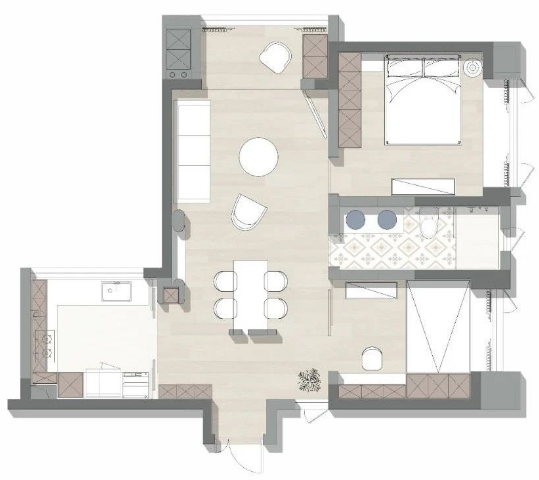 改變主臥動(dòng)線,衛(wèi)生間外移,擴(kuò)大操作空間。