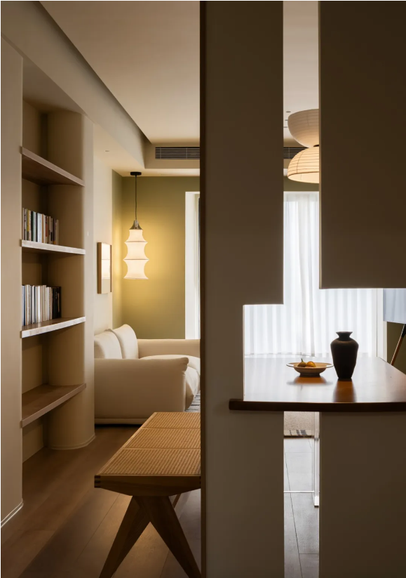 一間臥室,改變動(dòng)線后,設(shè)計(jì)為集辦公、儲(chǔ)物、閱讀、茶室、臨時(shí)客房一體的多功能空間。