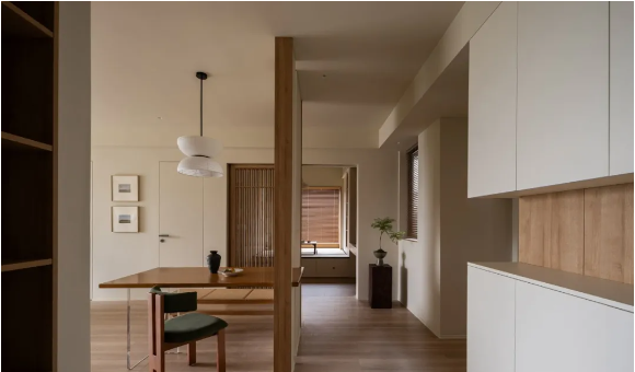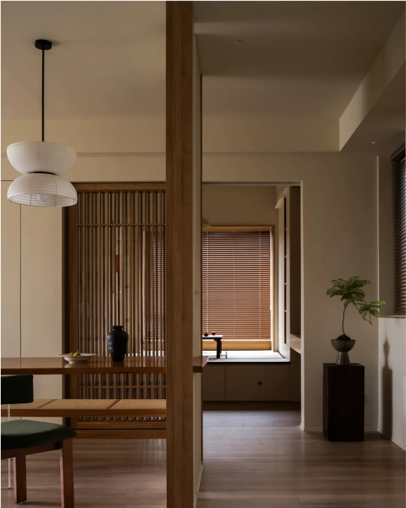 木柵推拉門可開(kāi)可合,內(nèi)外功能隨之互聯(lián),開(kāi)闊透亮之余,最大化放大空間視覺(jué)。